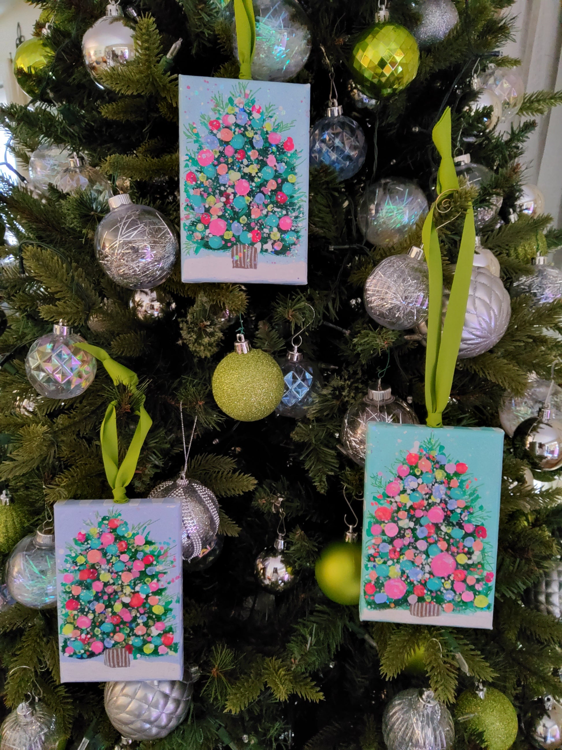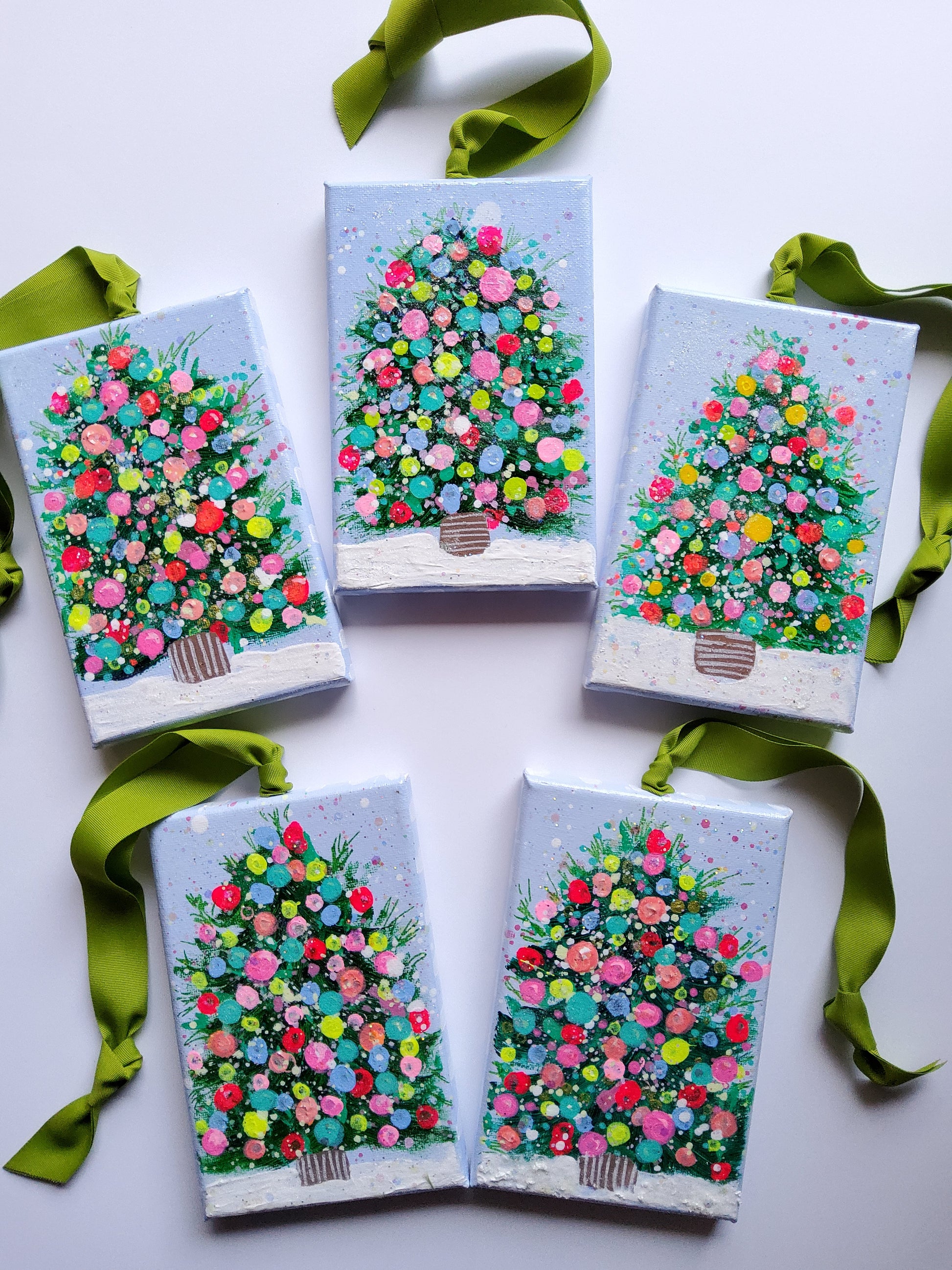 Each ornament is a hand-painted original featuring a confetti-style Christmas tree on cool backgrounds of aqua, sky, or pale lavender.