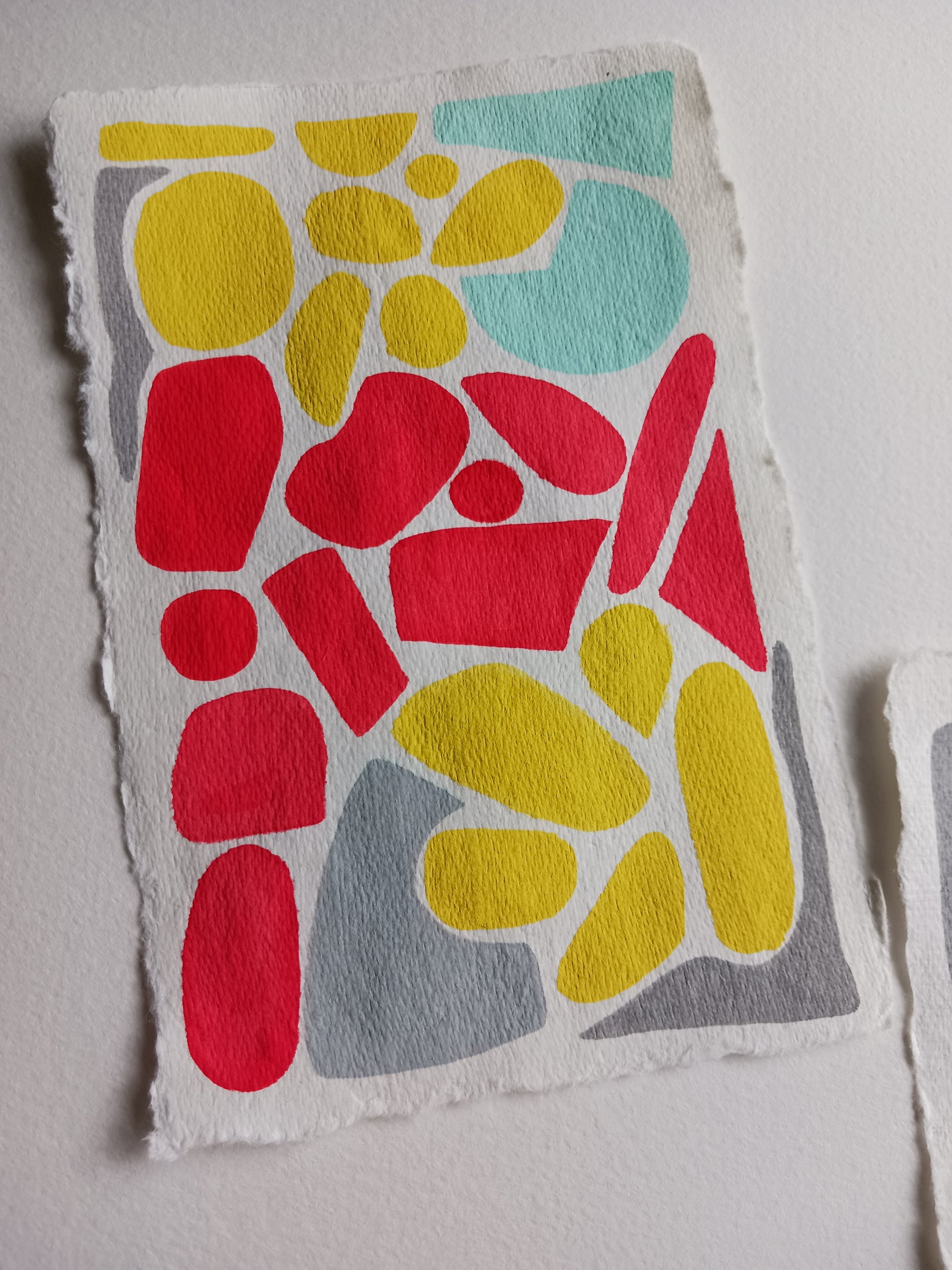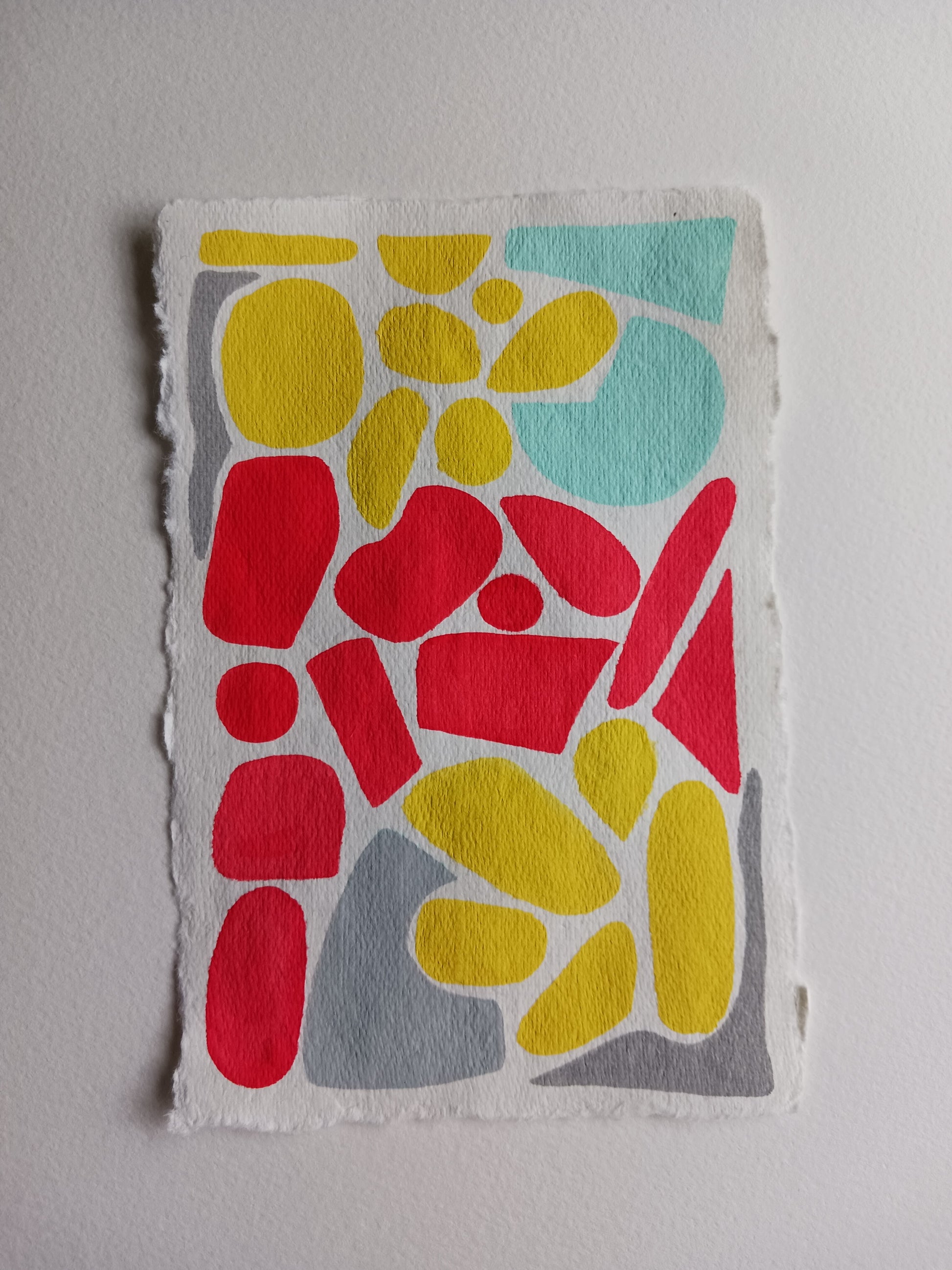 This lively color study painting bursts with vibrant free forms that dance across beautifully textured handmade paper with charming deckle edges, inviting you to explore a whimsical adventure of color and delightful experimentation!