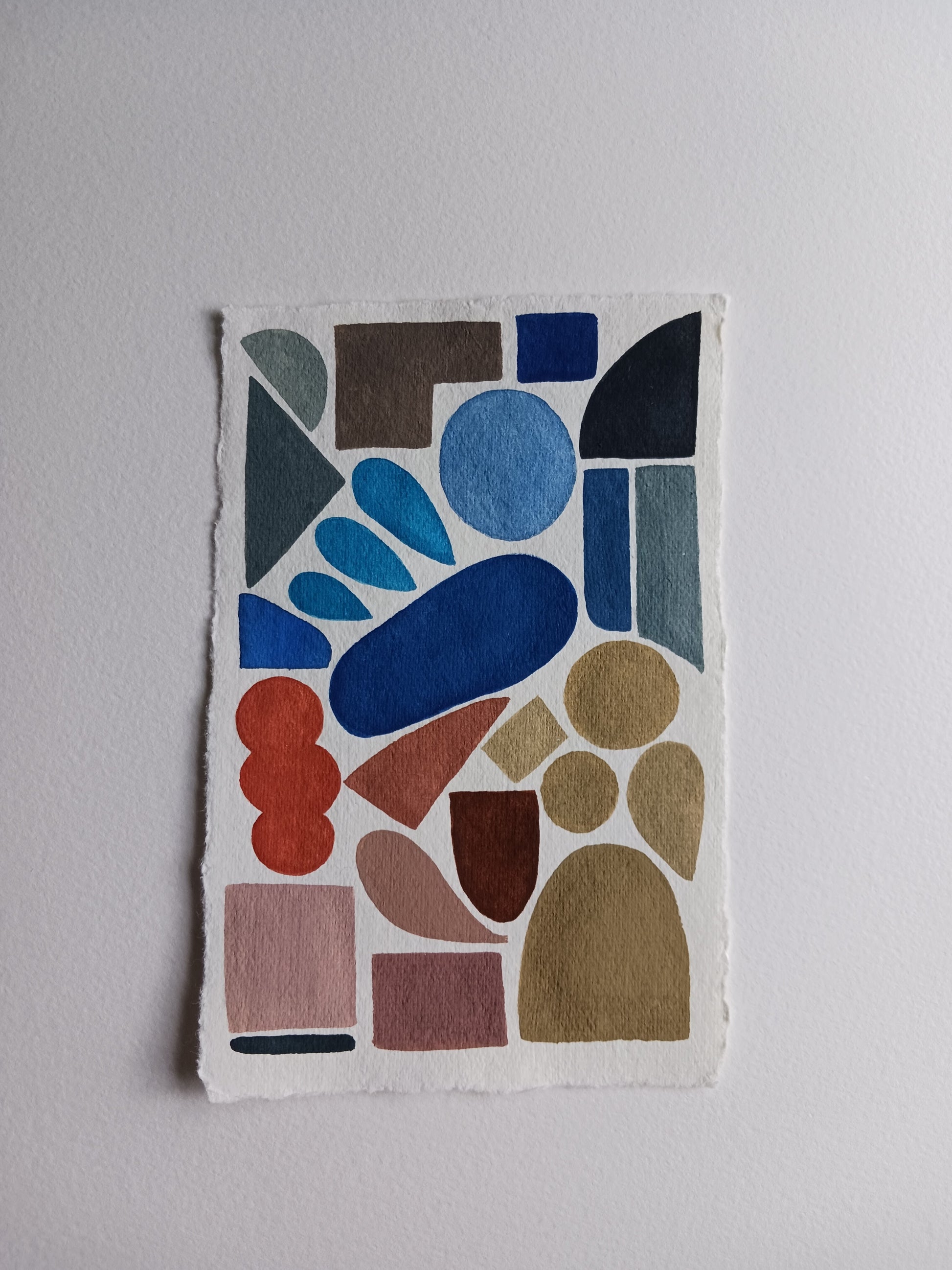 This lively color study painting bursts with vibrant free forms that dance across beautifully textured handmade paper with charming deckle edges, inviting you to explore a whimsical adventure of color and delightful experimentation!